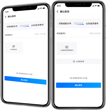 運單到達目的地后,點擊確認卸貨,輸入卸貨量,上傳卸貨現(xiàn)場照片和卸貨單(如果卸貨時上傳卸貨單,運單直接回單,等待貨主簽收。)