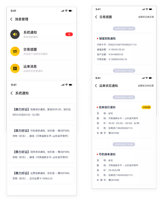 消息管理分為三大類,系統(tǒng)通知、交易提醒、運單消息。