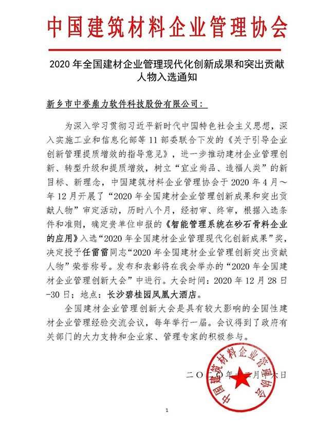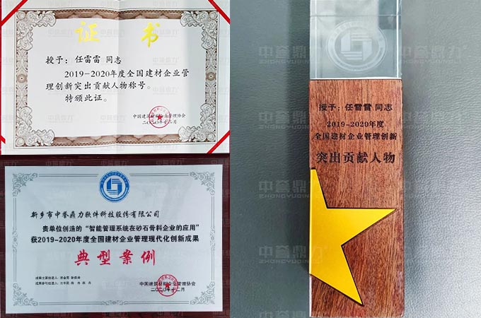 新鄉(xiāng)市中譽(yù)鼎力軟件科技股份有限公司作為礦山智能管理技術(shù)企業(yè)應(yīng)邀參會(huì),并憑借“智能管理系統(tǒng)在砂石骨料企業(yè)的應(yīng)用”獲評“2019-2020年度建材企業(yè)管理現(xiàn)代化創(chuàng)新成果”典型案例獎(jiǎng);公司常務(wù)副總經(jīng)理任雷雷被授予“2019-2020年度建材企業(yè)管理創(chuàng)新突出貢獻(xiàn)人物”稱號!