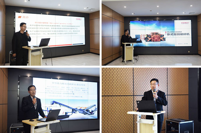 礦山設(shè)備新品發(fā)布環(huán)節(jié),中譽(yù)鼎力智能裝備有限公司技術(shù)陳碧、楊鵬飛、王興乾三位技術(shù)工程師,以結(jié)構(gòu)組成分析、性能特點(diǎn)介紹、同類設(shè)備對(duì)比、動(dòng)畫視頻演示等多種形式,先后對(duì)公司新品DLHGC600臥式旋回破碎機(jī)(粗碎)、DLHGC600M臥式旋回破碎機(jī)(中細(xì)碎)、移動(dòng)式破碎站、干式制砂樓四款設(shè)備進(jìn)行了詳盡的講解。