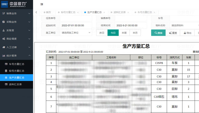 可按照車號方量,標號方量,生產(chǎn)方量、原料采購匯總相關報表,提供時間段、物料名稱、施工單位等篩選匯總需求信息,支持導出和打印等操作。