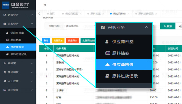 商砼站管理系統(tǒng)中采購業(yè)務包含供應商檔案、原料檔案、供應商料價、原料過磅記錄等單元數(shù)字化展現(xiàn),使采購業(yè)務環(huán)節(jié)管理簡單,透明清晰,可便于采購工作開展。
