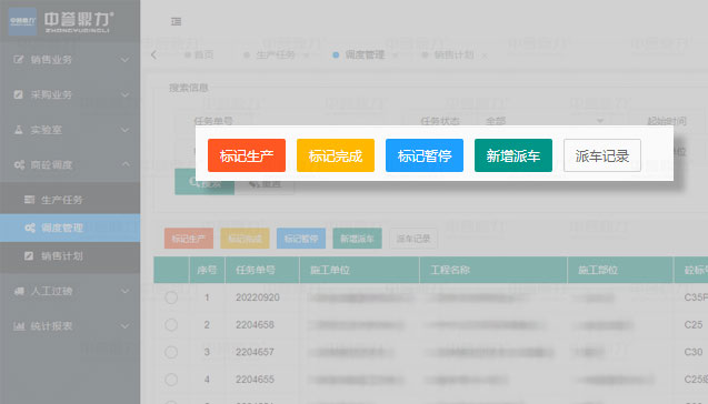 商砼站管理系統(tǒng)銷售業(yè)務模塊,主要統(tǒng)一商砼銷售環(huán)節(jié)所需信息,方便職工集中處理手頭工作。