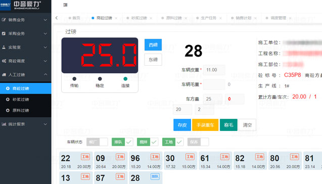 商砼站管理系統(tǒng)用于砂漿、商砼等混凝土企業(yè)經(jīng)營管理環(huán)節(jié)的商砼管理軟件,主要功能包括銷售業(yè)務模塊、采購業(yè)務模塊、實驗室模塊、商砼調(diào)度模塊、人工過磅模塊、統(tǒng)計報表模塊。