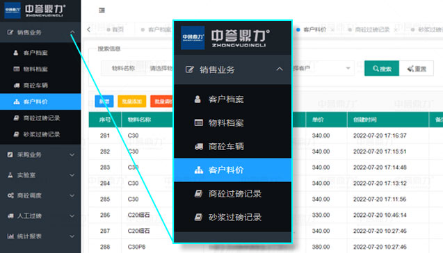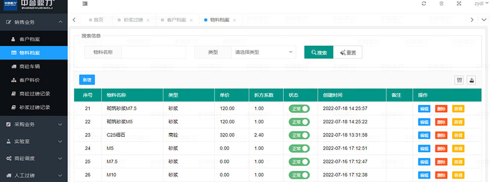 此模塊包含客戶檔案、物料檔案、商砼車輛、客戶料價、商砼過磅記錄、砂漿過磅記錄等信息管理。