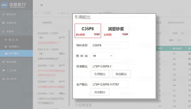 實驗室管理模塊包含配比倉、標準配比、生產(chǎn)配比單元,有多種商栓配方,支持自定義配方及現(xiàn)有配方比例的引用。