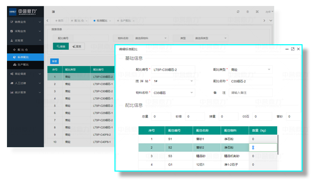 商砼站管理系統(tǒng)實驗室模塊,分配比倉、標準配比、生產(chǎn)配比單元。實驗室可以根據(jù)實際情況調整原料配比參數(shù),確認后發(fā)送配比(生產(chǎn)系統(tǒng)接收配比參數(shù))。