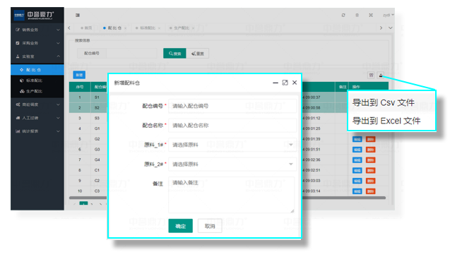 可錄入新增配料倉,現(xiàn)有配料倉信息修改,可把配比倉信息導出成Csv、Excel文件(支持篩選列導出)。