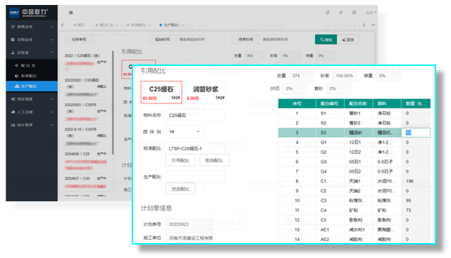 任務單號、時間段搜索查詢生產(chǎn)配比信息,可直接引用標準配比,通過配比物料數(shù)量實現(xiàn)砂率、摻量、05石、普砂配比。